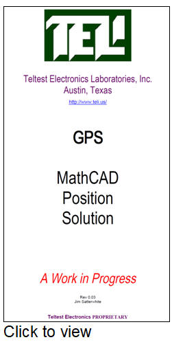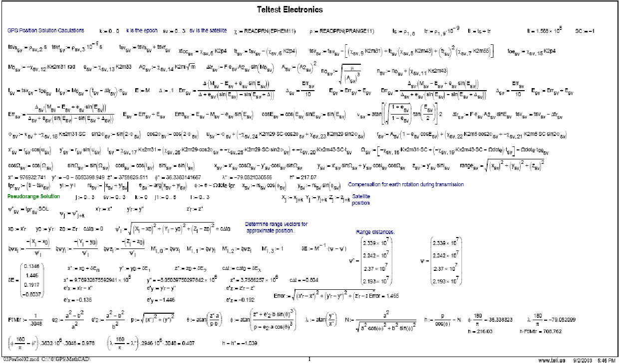 (.GPS Position Solution.) (.Electronic Prototyping.) (.Ethernet.) (.Proof of Concept.) (.Prototype.) Sometime ago TELI created a one page GPS position solution in Mathcad. It is a busy and interesting page. It starts with satellite ephemeris and pseudorange data as inputs and calculates the position of the receiver antenna first in earth centered xyz coordinates and then translates these to the lat/lon position. Below is a barely legible view of that page. For a clear view, download the .pdf file of it below. Click Mathcad GPS page above to view. |